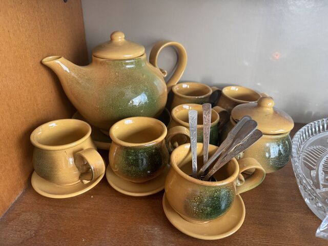 Komplekts ar tējkannu, 6 krūzītēm un cukurtrauku.
